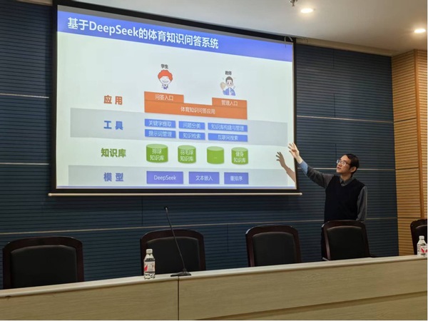 吴渊老师以“姿态估计技术的应用”为题,详细讲解了AI与体育相关的课题研究中关于关键点技术的研究内容。该研究主要通过人工智能技术从图像和视频中提取人体关键点,对关键技术动作和运动学指标进行分析,并将分析结果应用于体育教学和竞技体育辅助训练。此外,吴老师还以基于DeepSeek体育知识问答系统为例,详细讲解了应用、工具、知识库和模型等系统关键要素及系统部署方面的内容。