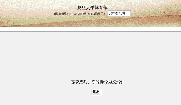 6.系统自动弹出本次考试的成绩(图 7),点击“退出”完成本次考试。如果考试过程中,因网络等各种原因提交失败,本次考试无效,学生可重新登录系统进行第二次考试。